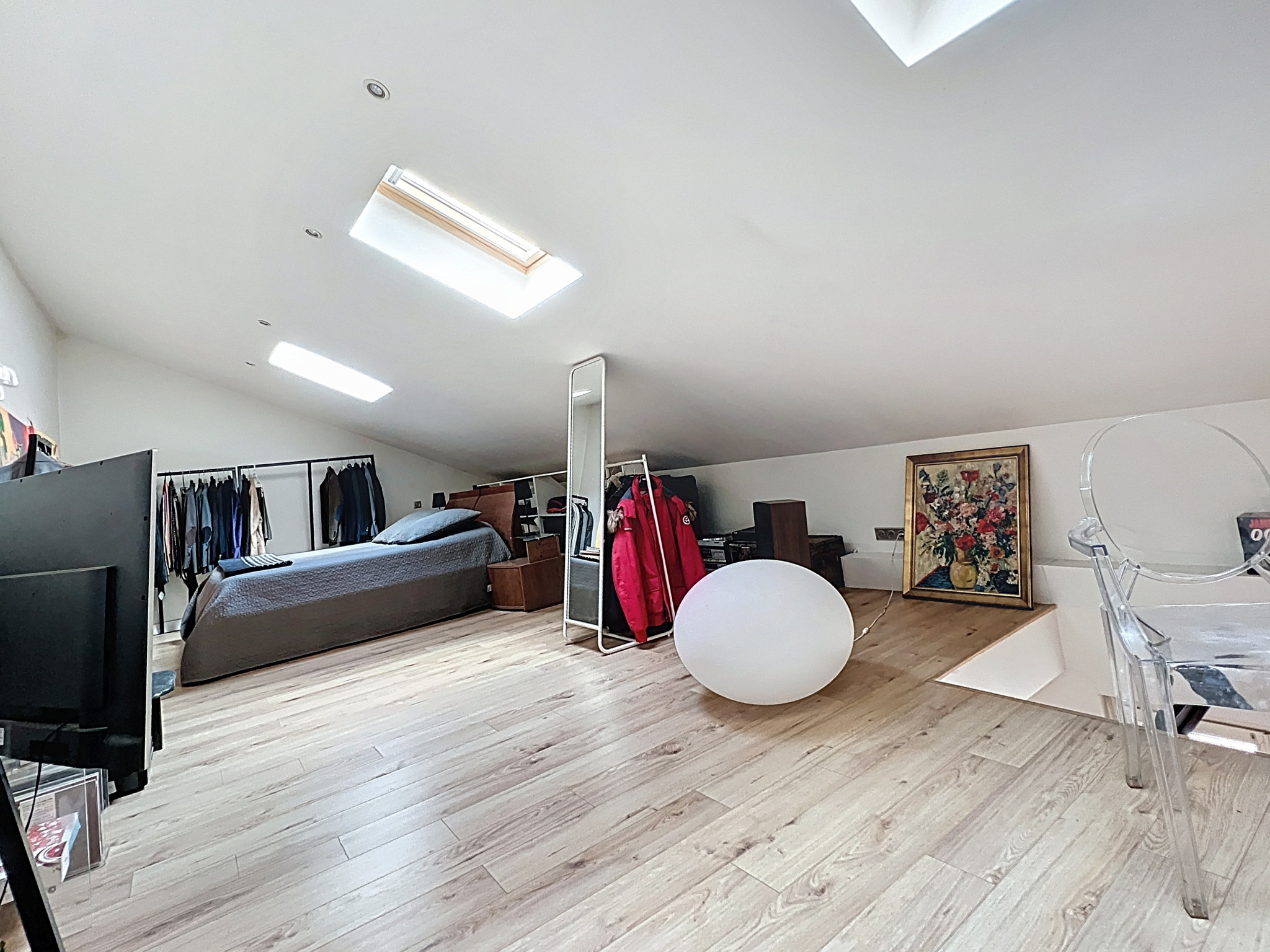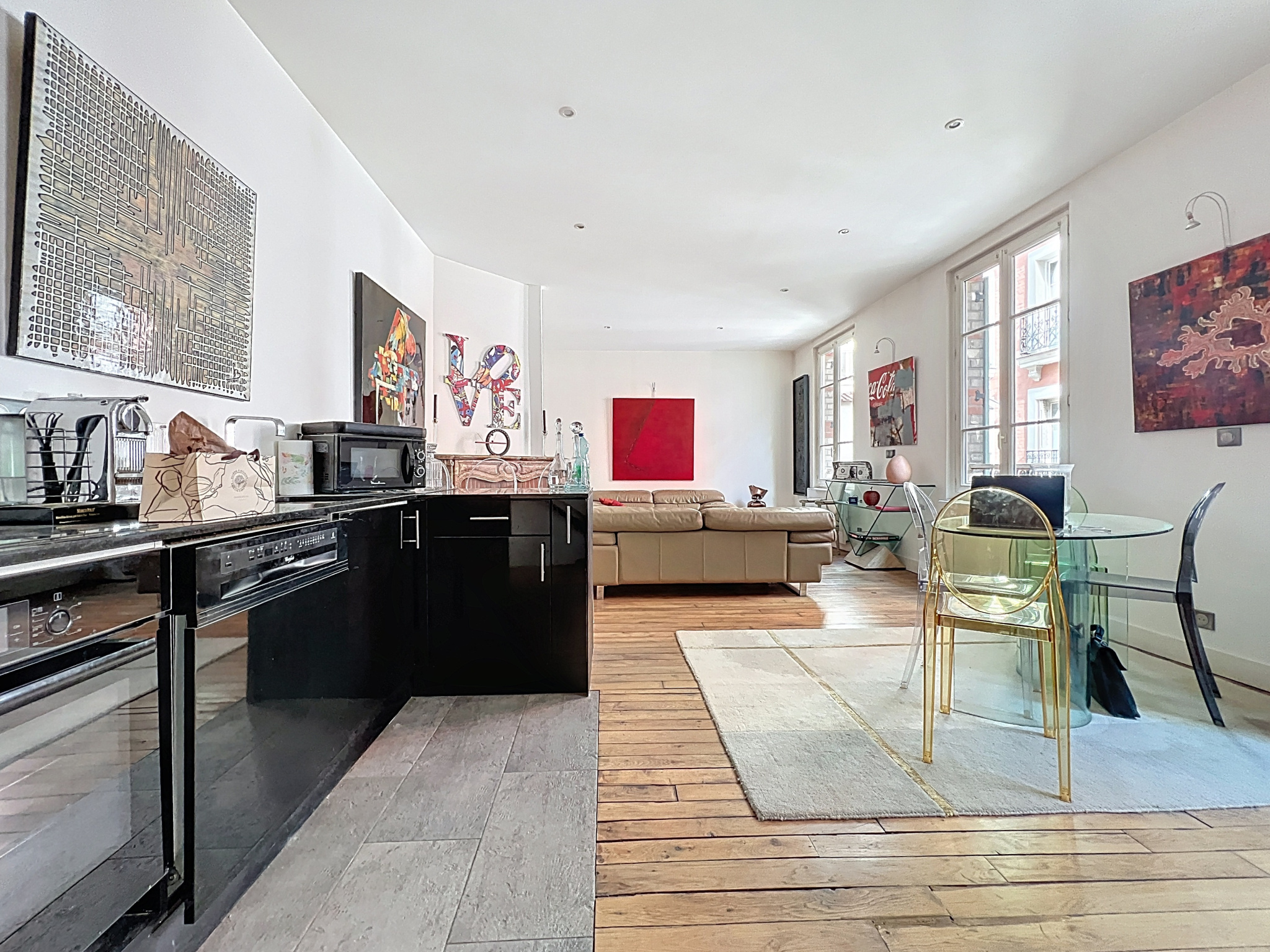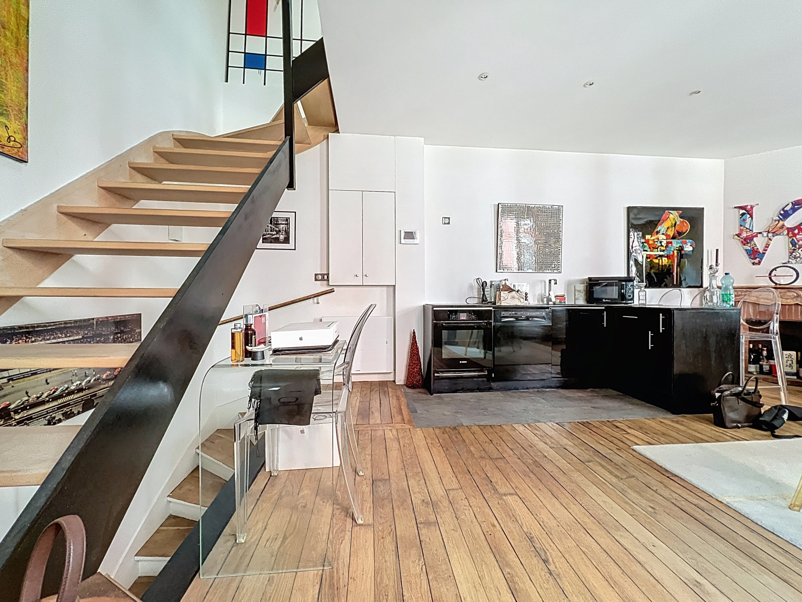 Au premier étage un grand séjour/salle à manger d'une surface de 38m2 avec une belle hauteur sous plafond de 2,83 mètres, une cuisine ouverte aménagée et équipée ainsi qu'un balcon de 8m2 donnant sur l'impasse.