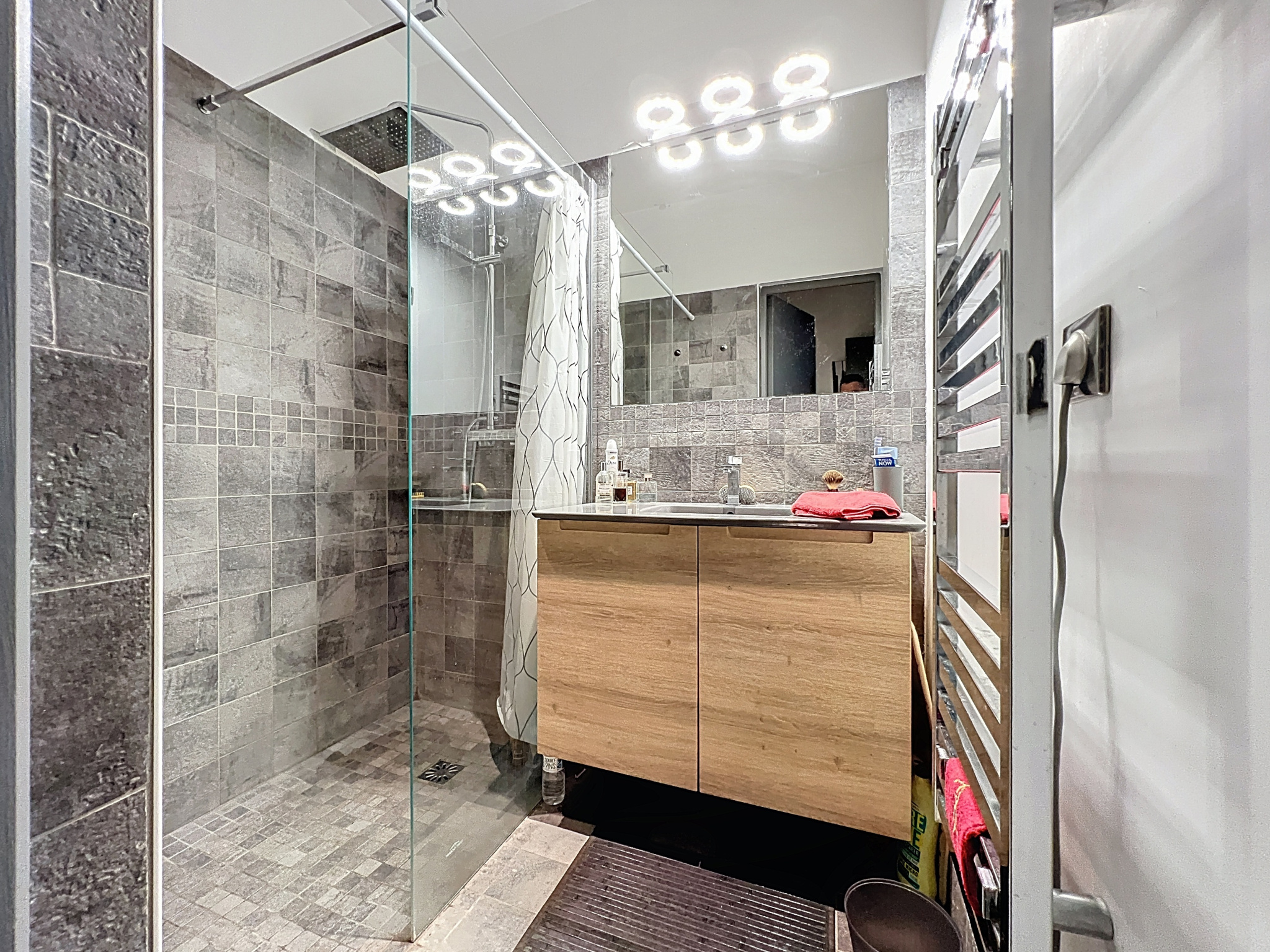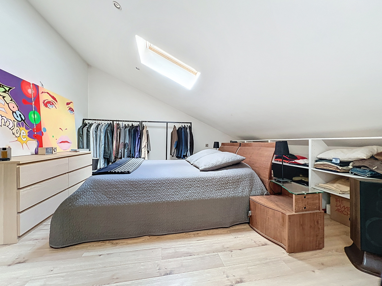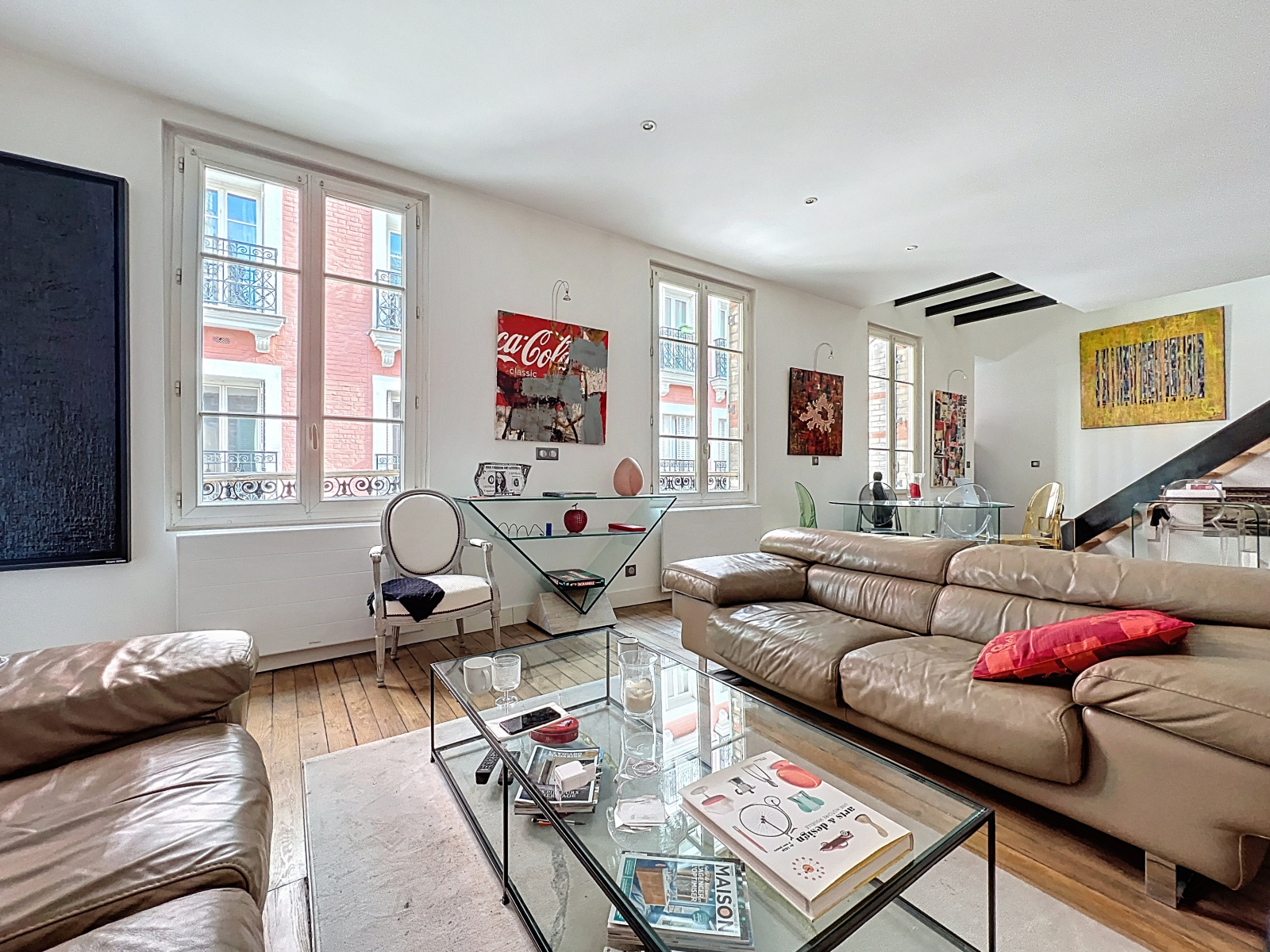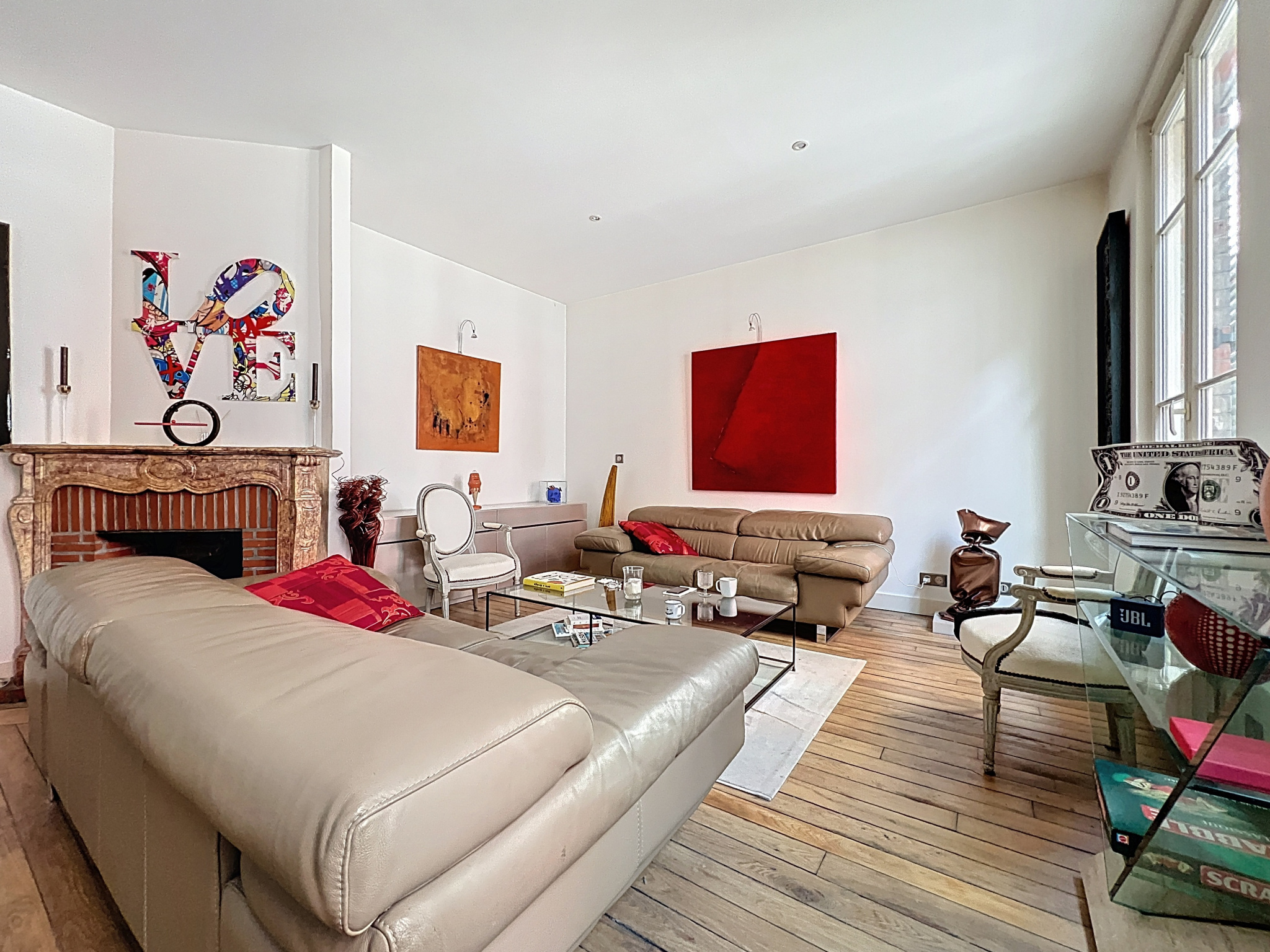 Au premier étage un grand séjour/salle à manger d'une surface de 38m2 avec une belle hauteur sous plafond de 2,83 mètres, une cuisine ouverte aménagée et équipée ainsi qu'un balcon de 8m2 donnant sur l'impasse.
