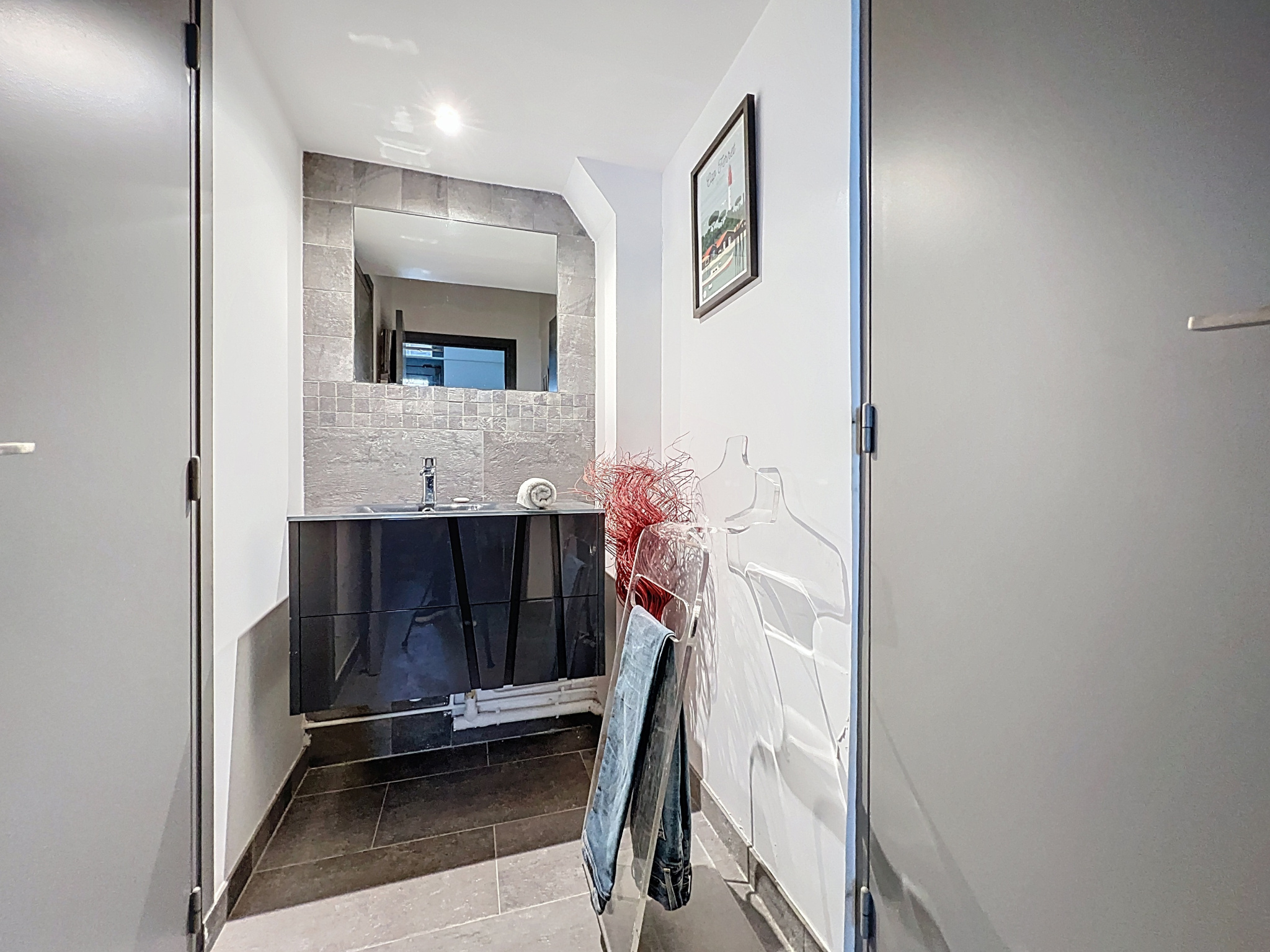 Au rez-de-chaussée une entrée, une salle d'eau, un WC séparé avec lave-mains indépendant, un dressing ainsi qu'un accès direct au garage de 16m2 (transformable en chambre).
